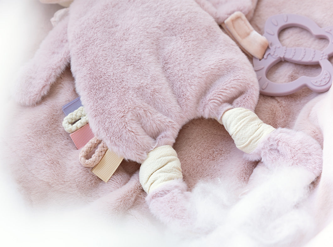 دميتنا مصنوعة من مخمل مينكي فائق النعومة وقطن طبيعي، مما يوفر ملمسًا دافئًا ومريحًا لبشرة الطفل الرقيقة. العضاضة المرفقة مصنوعة من سيليكون بلاتيني آمن غذائيًا معتمد من إدارة الغذاء والدواء الأمريكية - آمن تمامًا لتهدئة لثة الطفل.