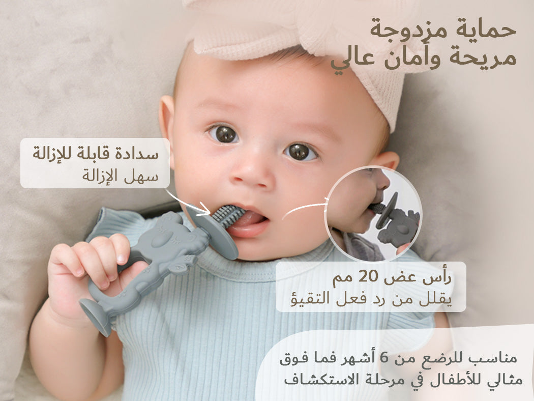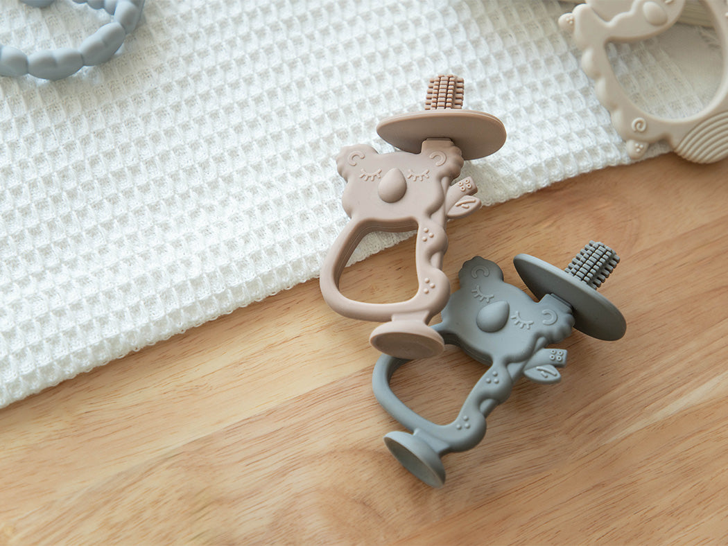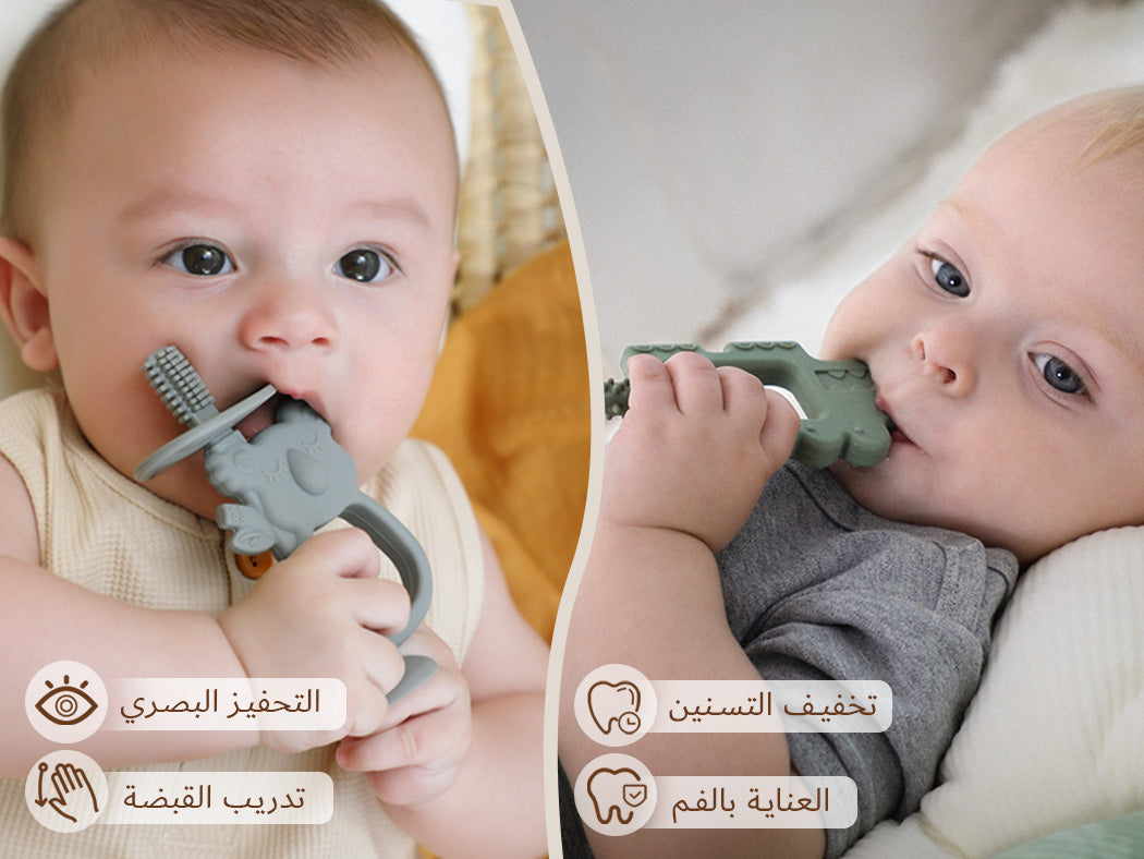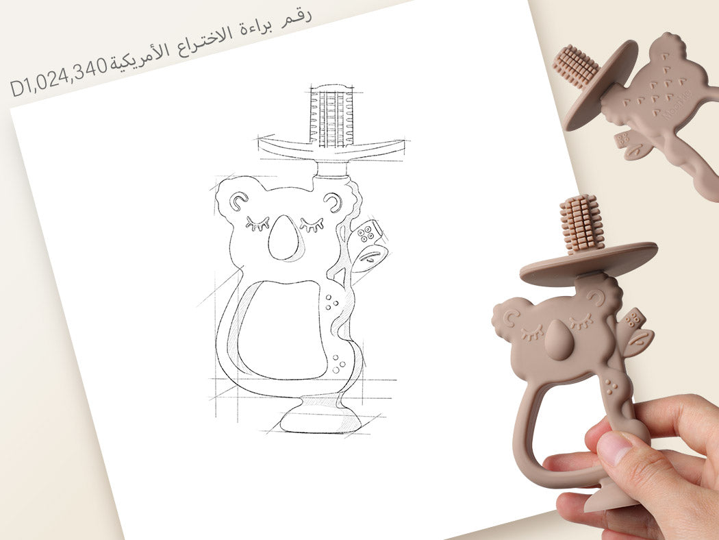الانتقال المثالي من فرشاة أصابع الوالدين إلى أول فرشاة أسنان للطفل الصغير، عضاضة كوالا 2 في 1 من Moonkie تهدئ اللثة المؤلمة بينما تبني مهارات التنسيق اللازمة لاستخدام فرشاة أسنان عادية في النهاية. مصممة من السيليكون القابل لاستخدامات الغذاء 100%، يمكن للطفل مضغ أي جزء من الفرشاة! سهلة الإمساك ولطيفة للغاية، عضاضة الكوالا لدينا ضرورية!